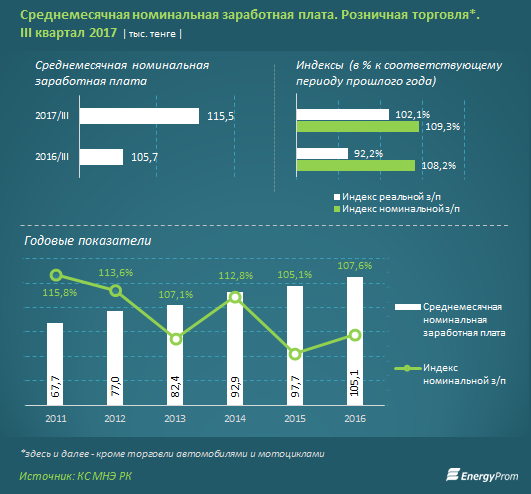 По итогам III квартала 2017 года сотрудники в сфере розничной торговли зарабатывали в среднем по РК 115,5 тысячи тенге в месяц.