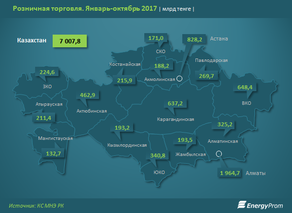 Почти 40% всей официально проведенной по чекам розничной торговли пришлось на Алматы (2 трлн тг) и Астану (828,2 млрд тг).