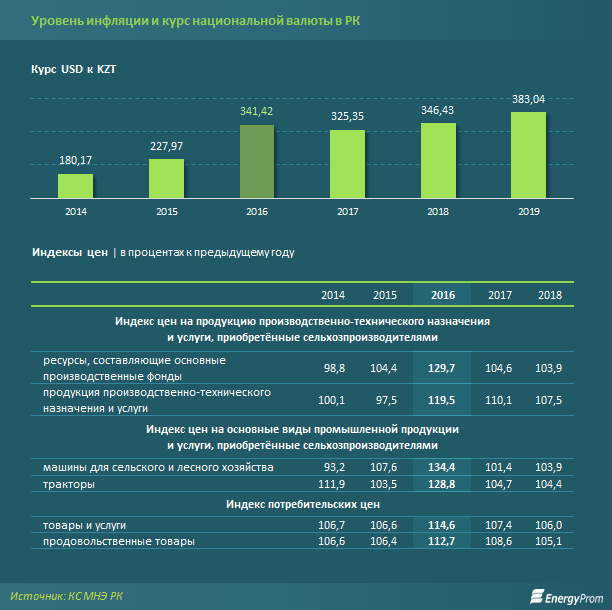 Резкое удорожание ввозимой техники и диктат цен импортёров, «завязанных», в отличие от цен отечественных производителей, исключительно на валютный курс, подорвали всю цепочку — от АПК до переработки сельхозпродукции и пищепрома. В результате продовольственные товары в целом подорожали в Казахстане в 2016 году на 12,7%, а некоторые продукты питания — на опасные 23-24%.