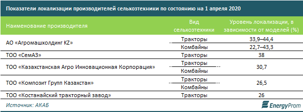 Так, например, степень локализации тракторов производства АО «Агромашхолдинг KZ» достигает 44,4%, а комбайнов этой же компании — 43,3%. До 26% локализовано производство тракторов ТОО «Костанайский тракторный завод», до 38% — ТОО «СемАЗ». 30,7% — уровень локализации техники для АПК производства ТОО «Казахстанская Агро Инновационная Корпорация», 26,5% — ТОО «Композит Групп Казахстан».