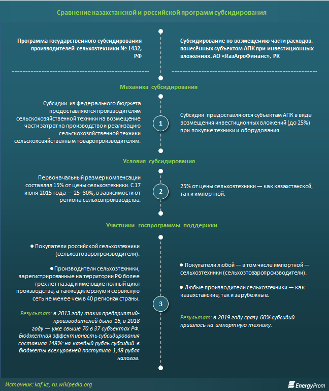 Для сравнения: наш сосед по ЕАЭС, Российская Федерация, не тратит средства на импортёров и зарубежную технику. В стране действует Госпрограмма № 1432, предусматривающая адресную поддержку российского сельхозмашиностроения. Субсидии из федерального бюджета предоставляются непосредственно производителям сельскохозяйственной техники на возмещение части затрат на производство и реализацию сельхозтехники сельскохозяйственным товаропроизводителям.