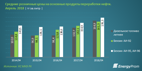 Бензин АИ-95/96 подорожал за год на 15,1%, до 178 тенге за литр; наиболее популярный АИ-92 — на 13,5%, до 161 тенге за литр.