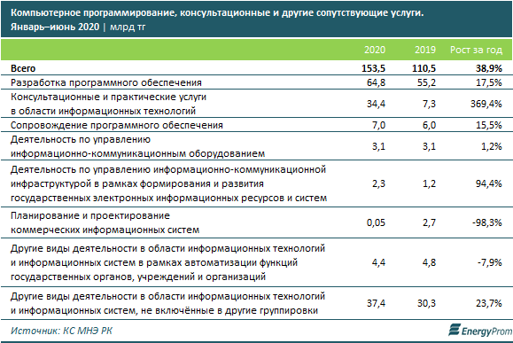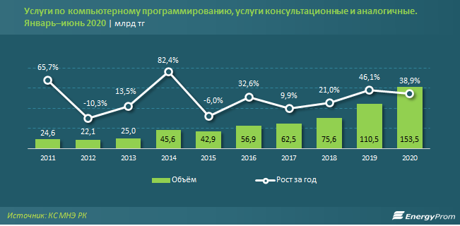 Объём услуг по компьютерному программированию, а также консультационным и аналогичным услугам за первое полугодие 2020 года составил 153,5 млрд тг — на 38,9% больше по сравнению с прошлым годом (ИФО — 135%).