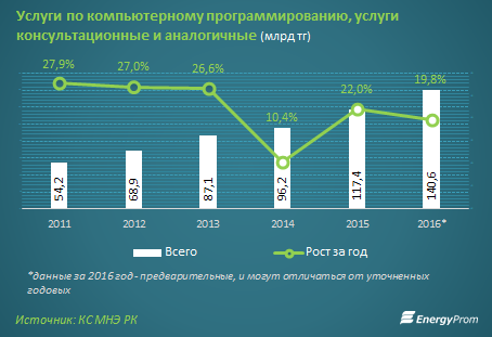 По итогам 1 квартала 2017 года объем услуг по компьютерному программированию и консультациям составил 28,3 млрд тг, против 21,4 млрд тг годом ранее (+32%).