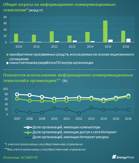 Общие затраты предприятий на информационно-коммуникационные технологии составили в 2016 году 269,5 млрд тг. Из них затраты на приобретение программных средств, используемых на основе лицензионного соглашения, составили 37,1 млрд тг — на 46,3% меньше, чем годом ранее. Самостоятельная разработка программного обеспечения, напротив, показала значительный прирост: +33%, до 11,6 млрд тг.