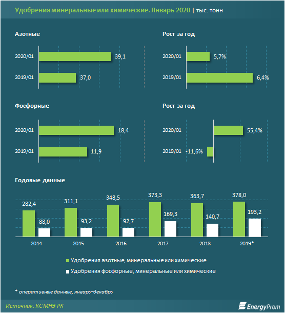 В целом за январь–декабрь 2019 года в Казахстане произвели 193,2 тыс. тонн фосфорных и 378 тыс. тонн азотных удобрений. Для сравнения: в январе–декабре 2018-го производство фосфорных удобрений составляло 140,7 тыс. тонн, азотных – 363,2 тыс. тонн*.