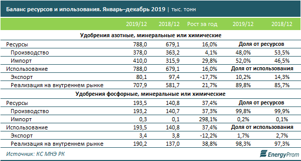 Что касается фосфорных удобрений, здесь рынок полностью обеспечен местным производством. Так, за январь–декабрь 2019 года казахстанские компании перекрыли спрос (экспорт плюс реализация на рынке) на 99,8%. Примечательно, что, по официальным данным, на экспорт ушло всего 3,4 тыс. тонн фосфорных удобрений.