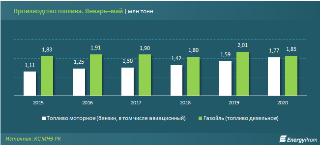 За 5 месяцев 2020 года в стране было произведено 1,8 млн тонн бензина, включая авиационный, — на 11,8% больше, чем в январе–мае прошлого года. Производство дизельного топлива, напротив, сократилось на 8,3% за год, до 1,8 млн тонн.