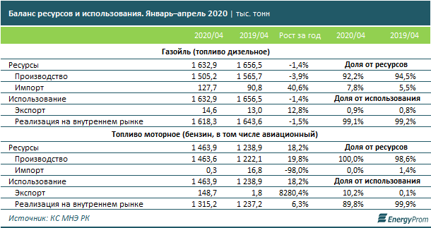 По итогам четырёх месяцев текущего года казахстанские компании обеспечили 92,2% спроса (экспорт плюс реализация на рынке) на дизельное топливо. На фоне спада производства заметно вырос импорт в секторе — на 40,6%.