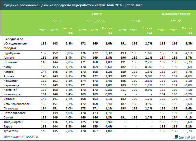 В мае 2020 года бензин марки АИ-92 в среднем в городах РК стоил 152 тг за литр — на 2,9% больше, чем годом ранее. Бензин АИ-95/96 подорожал на 2%, до 172 тг за литр, АИ-98 — на 2,7%, до 191 тг.