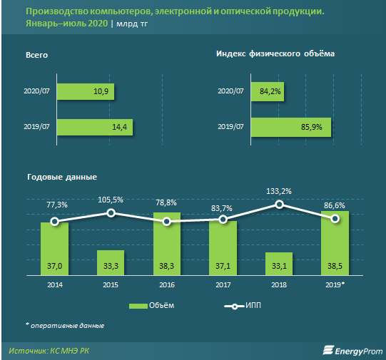 Объём производства компьютеров, электронной и оптической продукции за январь–июль 2020 года составил 10,9 млрд тг — на 24,3% меньше, чем за аналогичный период прошлого года. Индекс промышленного производства — 84,2%.