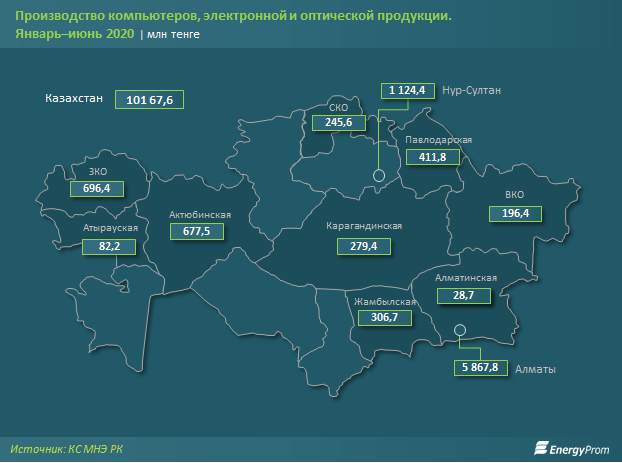 Среди регионов РК за январь–июнь 2020 года более половины объёма производства компьютеров, электронной и оптической продукции приходится на Алматы: 5,9 млрд тг — на 14,6% меньше, чем в прошлом году. Здесь находится компания «Логиком» — производитель высокотехнологичного оборудования с производственной мощностью более 900 тыс. персональных компьютеров и серверов в год. Следом идут столица (1,1 млрд тг) и Западно-Казахстанская область (696,4 млн тг).