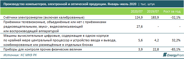 Производство счётчиков электроэнергии сократилось на 32,1%, до 124,9 тыс. штук, а приборов для контроля прочих физических величин — сразу на 83,1%, до 3,9 тыс. штук. Кроме того, за январь–июль 2020 года было произведено 27,6 тыс. телевизионных приёмников.