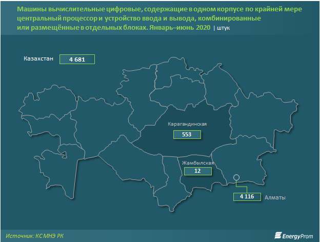 Почти 88% всей произведённой компьютерной техники приходится на Алматы, где за первое полугодие было собрано 4,1 тыс. компьютеров и ноутбуков — на 26,1% больше, чем годом ранее. Следом идут Карагандинская (553 шт.) и Жамбылская (12 шт.) области.