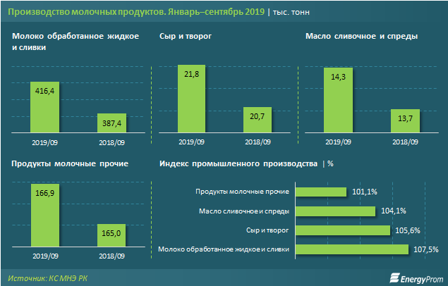 Объём производства молочных продуктов в Казахстане за январь–сентябрь 2019 года вырос с 214,3 млрд до 225,2 млрд тг за год. Индекс промышленного производства второй год подряд составляет 101,8%. Для сравнения: ИПП всех пищевых продуктов в РК в 2019 году составил 102,5% (1,2 трлн тг), в 2018 году — 103,3% (1,1 трлн тг). При этом доля молочной продукции в пищевых продуктах осталась на уровне 18,8%.