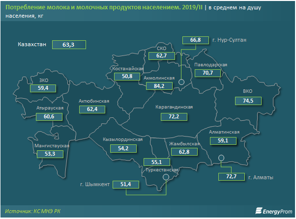 Сокращение объёма потребляемых казахстанцами молока и молочных продуктов было отмечено в 12 из 17 регионов РК. Заметнее всего потребление снизилось в городе Шымкенте — на 26,1%, до 51,4 кг (литров), — а также в Манигстауской (-10,9%) и Павлодарской (-10,5%) областях.