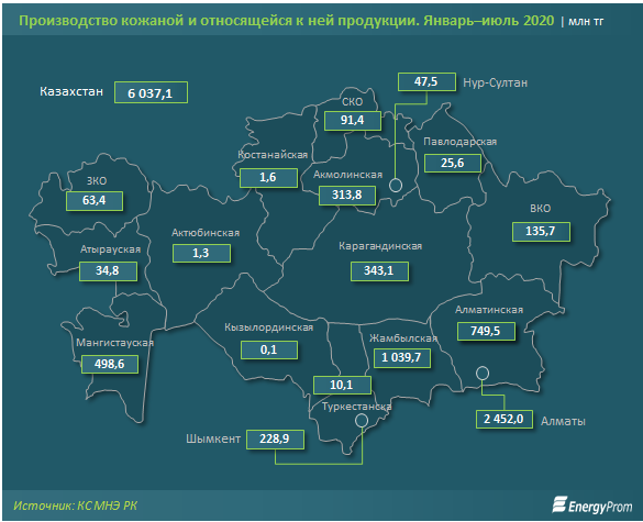 Более 70% объёма произведённой кожаной и относящейся к ней продукции приходится лишь на 3 региона. Лидирует Алматы, где за январь–июль 2020 года объём составил 2,5 млрд тг, увеличившись за год на 22,8%. Следом идут Жамбылская (1 млрд тг) и Алматинская (749,5 млн тг) области.