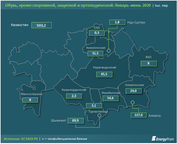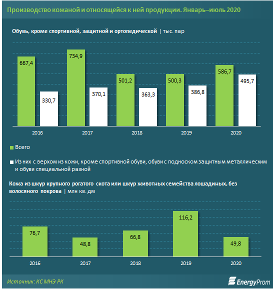 За первое полугодие 2020 года было произведено 503,2 тыс. пар кожаной обуви (+17,1%). Среди регионов РК с объёмом выпуска в 227 тыс. пар лидирует Алматы, где расположена компания Shoes Republic, в которой приобрёл обувь президент РК Касым-Жомарт Токаев. Следом идут Шымкент (69,9 тыс. пар) с фабрикой ТОО «Lux Shoes» и Жамбылская область (54,6 тыс. пар) с фабрикой ТОО «ТаразКожОбувь».