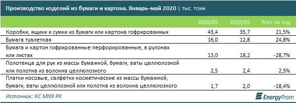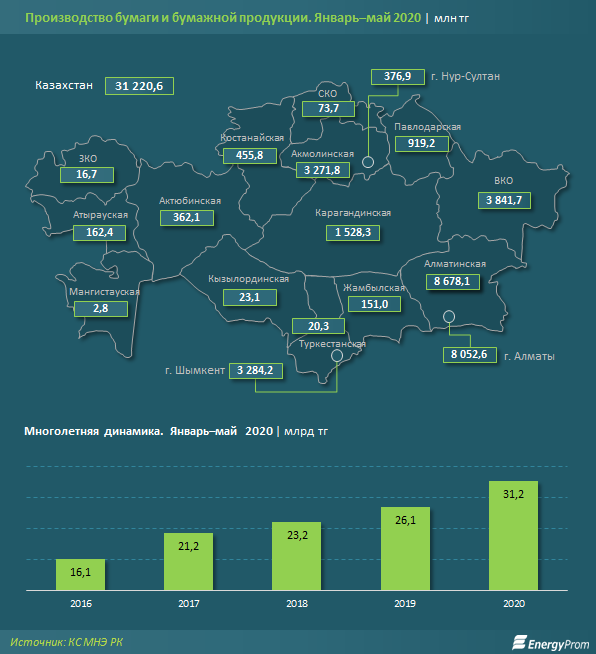 Производство бумаги и бумажной продукции в РК за январь–май 2020 года в денежном выражении достигло 31,2 млрд тг, увеличившись по сравнению с январём–маем прошлого года на 19,8%. Индекс промышленного производства составил 114,8%.