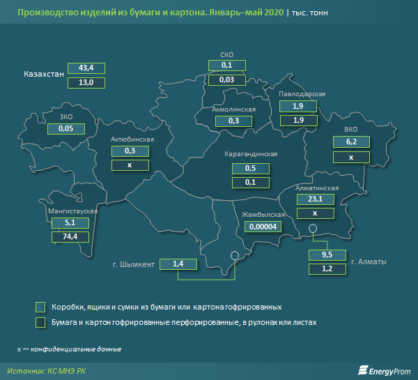 Объёмы производства гофрированных перфорированных бумаги и картона в рулонах или листах известны только в Павлодарской области (1,9 тыс. тонн) и Алматы (1,2 тыс. тонн). Подобные производства работают и в Алматинской, Восточно-Казахстанской и Актюбинской областях, причём именно на эти регионы приходится более 75% всего выпуска, однако данные по ним Комитет по статистике МНЭ РК не предоставил (конфиденциальны).