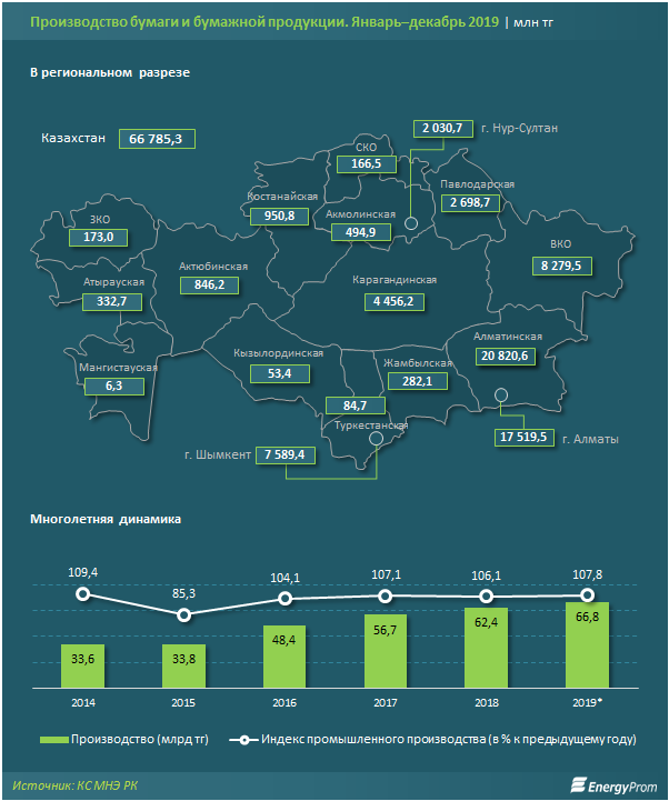 За 12 месяцев 2019 года в стране произвели бумаги и бумажных изделий на 66,8 млрд тг — на 14,6% больше, чем годом ранее*. По данным Комитета по статистике МНЭ РК, реальный рост производства в секторе с учётом инфляции составил 7,8%.