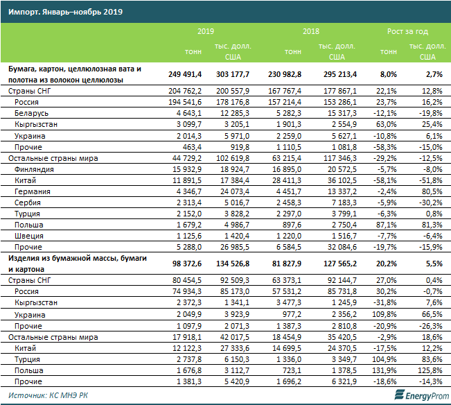 Импорт в секторе также значителен: за 11 месяцев в РК завезли бумажных изделий сразу на 134,5 млн долларов, и ещё на 303,2 миллиона — самого сырья, бумаги и картона