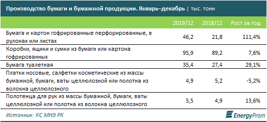 В целом местные компании относительно неплохо перекрывают рынок гигиенических принадлежностей в секторе (туалетной бумаги, платков, салфеток и полотенец). Здесь спрос (внутренние продажи и экспортные поставки) по итогам 11 месяцев 2019 года обеспечен казахстанскими производителями на 70%. На 71,7% обеспечен спрос на тетради.