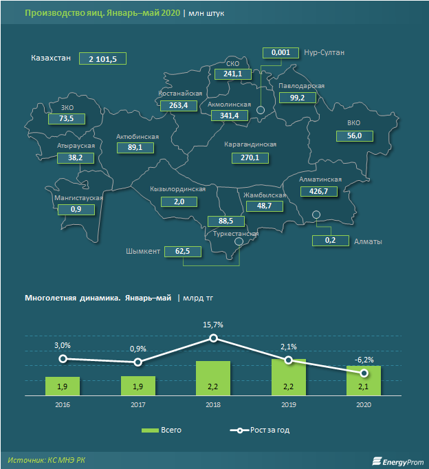 За январь–май 2020 года казахстанские птицеводы произвели 2,1 млрд яиц — сразу на 6,2% меньше, чем в январе–мае прошлого года. В региональном разрезе наибольший объём производства пришёлся на Алматинскую область: 426,7 млн яиц — на 5,9% меньше, чем годом ранее. В Алматинской области работают такие производителями яиц, как ТОО «Алсад Казахстан», ТОО «Алматинская птицефабрика Сункар» и т. д.