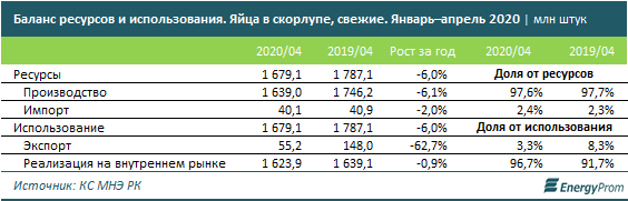 Пока, согласно данным Комитета по статистике, за январь–апрель 2020 года казахстанские компании обеспечили спрос (экспорт плюс реализация на рынке) на свежие яйца в скорлупе на 97,6%. На долю импорта пришлось 2,4%, за год импорт сократился на 2%.