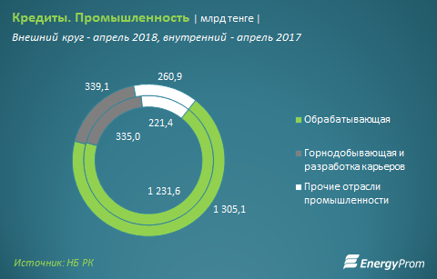 Наибольшая концентрация займов, традиционно, приходится на сегмент переработки — 1,3 трлн тг, +6% год-к-году. На горнодобывающую отрасли пришлось 339,1 млрд тг, +1,2% за год, на прочие промотрасли — 260,9 млрд тг, сразу +17,9% за год.