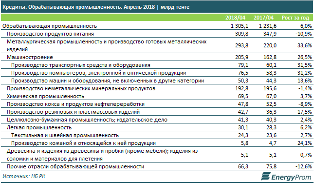 Примечательно, что в тройке лидеров металлургия — в наибольшем плюсе (+33,6% за год, до 293,8 млрд тг), кредитная поддержка машиностроения — также выросла (+26,5% за год, до 205,9 млрд тг), а вот кредитование пищепрома — в минусе (на 10,9% меньше, чем год назад — это 309,8 млрд тг).