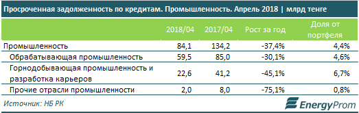 Промышленники — аккуратные заемщики. Доля просрочки в портфеле займов промотрасли — всего 4,4%. Самый «чистый» портфель — у электроэнергетики, водоснабжения и прочих подобных промышленных сфер — всего 0,8% просрочки (2 млрд тг, на 75,1% меньше, чем год назад).