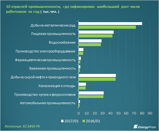 За последний год (1 квартал 2017 года к 1 кварталу 2016 года) наиболее быстро восстанавливают свои кадровые резервы предприятия, занимающиеся добычей металлических руд (+7,8 тысяч человек, или 11%), компании пищевой промышленности (+1,6 тысяч человек, или 4%) и в водоснабжении (+0,9 тысяч человек, или 3%).