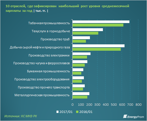 Самый большой рост среднемесячной номинальной заработной платы по сравнению с уровнем годом ранее был зафиксирован на предприятиях табачной промышленности — за год зарплаты здесь увеличились на 75,4 тысячи тенге, или на 12%.