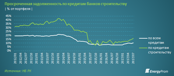 Качество портфеля кредитов, предоставленных казахстанскими банками представителям строительной отрасли, продолжает ухудшаться, особенно быстро это процесс происходит в последние отчетные 3 месяца (май-июль). За текущий год доля займов в строительстве, обслуживаемых с просрочкой платежей, выросла с 11% на начало года до нынешних 16,4%.