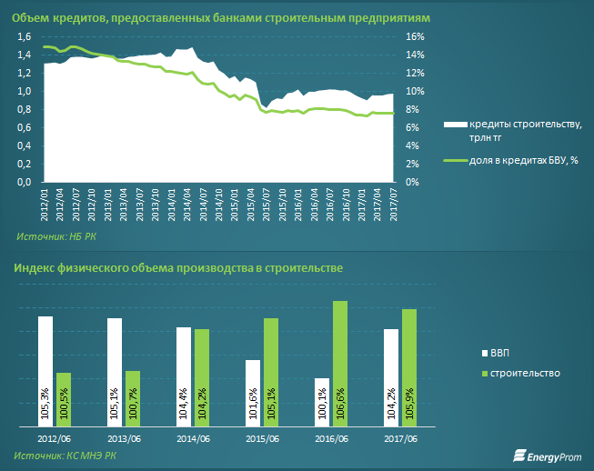 За 1 полугодие 2017 года строительные компании выпустили на 5,9% больше продукции в физическом выражении, чем год назад. В целом экономика РК выросла на 4,2% за указанный период.