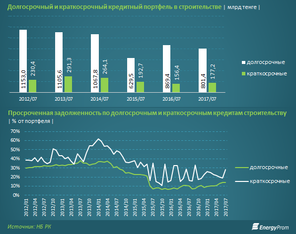 Основная тема для беспокойства кредиторов — растущая просрочка по длинным кредитам в отрасли. За 7 месяцев текущего года доля неработающих кредитов в долгосрочном порфтеле выросла с 8,7% до 13,7%. На этом фоне выдача длинных кредитов стройкомпаниям была заморожена, объем портфеля таких ссуд за год сократился на 7,8% до 801,4 млрд тенге.
