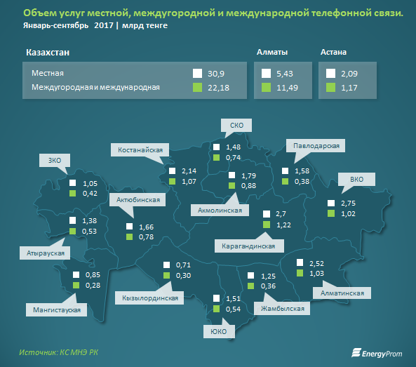 Постепенно отходят от услуг местной телефонии главные регионы-потребители этого сегмента — Алматы (-6,3% за год), ВКО (-8,6% за год), и Карагандинская область (-8,1% за год). В целом, телефонные сервисы теряют популярность практически во всех регионах. Незначительный прирост (всего +0,4%) отмечен лишь для Атырауской области.