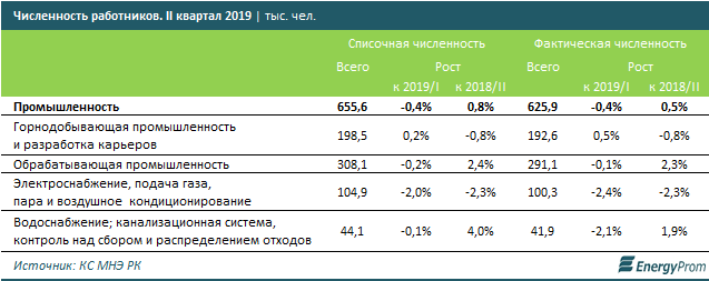 Фактическая численность достигла 625,9 тыс. сотрудников — на 0,5% больше, чем год назад. Из них 192,6 тыс. человек заняты в горнодобывающей сфере (минус 0,8% за год), 291,1 тыс. сотрудников — в обрабатывающем сегменте (сразу плюс 2,3% за год), 100,3 тыс. человек — в электро- и теплоснабжении (минус 2,3% за год), 41,9 тыс. работников — в водоснабжении и водоотведении (плюс 1,9% к аналогичному периоду годом ранее).