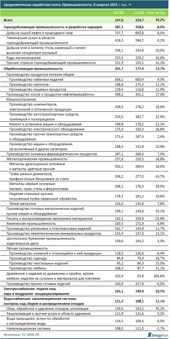 Заработные платы промышленников в среднем составляли 247,6 тысячи тенге в месяц — на 1,6% больше, чем в прошлом квартале, и сразу на 10,2% больше, чем во II квартале прошлого года. С учётом инфляции рост покупательной способности заработных плат в секторе достиг 4,8% за год.