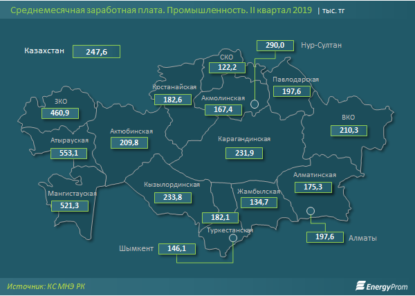 В региональном разрезе самые высокие зарплаты наблюдались в трёх нефтегазодобывающих областях: Атырауской (553,1 тыс. тг, +3,6% за год), Мангистауской (521,3 тыс. тг, +6,7% за год) и Западно-Казахстанской (460,9 тыс. тг в месяц, сразу +23% за год) областях.
