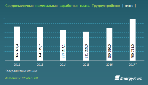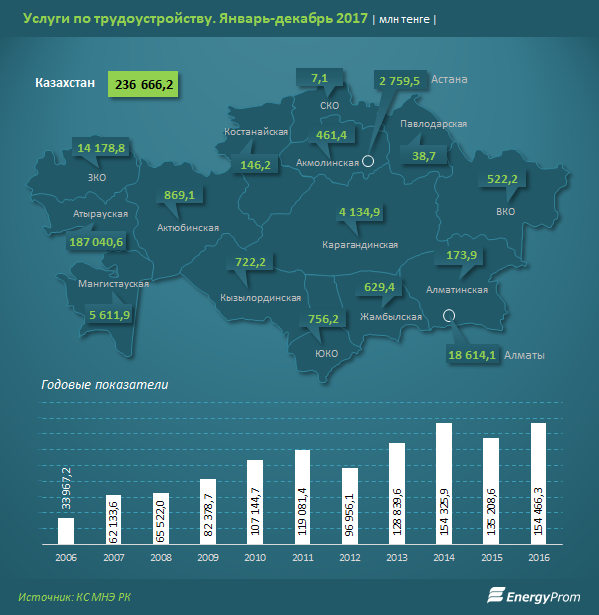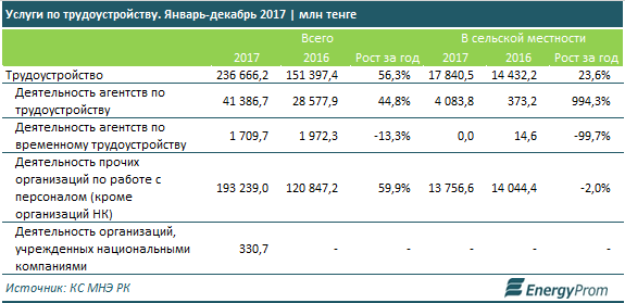 По итогам января-декабря 2017 объем услуг по трудоустройству составлял уже 236,7 млрд тг — сразу на 56, 3% больше, чем в аналогичном периоде годом ранее*.