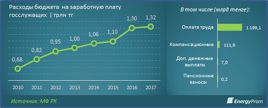 За 2016 год расходы госбюджета на заработную плату работников госсектора увеличились на 18%, составив 1,30 трлн тенге. В текущем году рост составит только 1%, объем выделенных средств увеличится до 1,32 трлн тенге. В том числе на оплату труда будет приходиться 1,2 трлн тенге, 112 млрд тенге компенсационных выплат, 7 млрд тенге на дополнительные денежные выплаты и еще 242 млн тенге на обязательный пенсионный взнос.