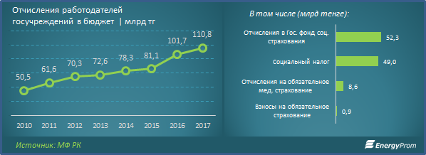 Увеличение бюджетных средств на оплату труда госслужащих оказало влияние на соответствующий рост налоговых и прочих отчислений работодателей на 25%, составив 101,8 млрд тенге. В том числе отчисления в государственный Фонд социального страхования составили 52,3 млрд тенге, социальный налог — 49 млрд тенге.