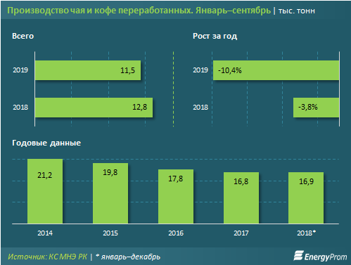 Несмотря на это, производство переработанного чая и кофе в РК продолжает снижаться. Так, за январь–сентябрь текущего года в Казахстане произвели 11,5 тыс. тонн чая и кофе — на 10,4% меньше по сравнению с аналогичным периодом прошлого года (12,8 тыс. тонн).