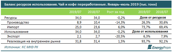 За семь месяцев текущего года 73,7% спроса на чай и кофе традиционно обеспечил импорт: 25 тыс. тонн — на 6% больше, чем в соответствующем периоде прошлого года (23,6 тыс. тонн). Собственное производство перекрыло лишь 26,3% спроса (годом ранее — 30,6%).