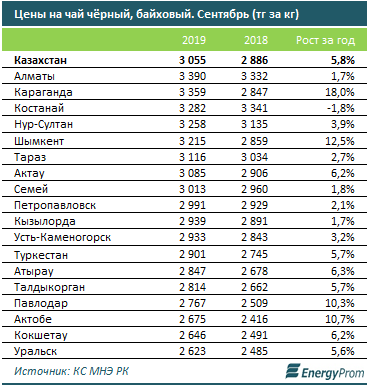 Увеличение объёмов реализации сопровождалось ростом цен. Так, в сентябре текущего года цена черного чая увеличилась на 5,8% и составила 3054,8 тг за кг (годом ранее — 2886,4 тг за кг).
