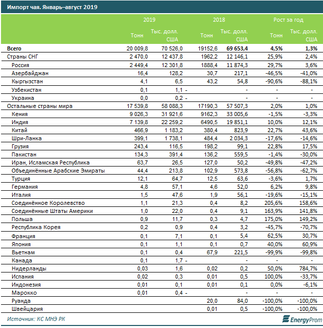 За январь–август текущего года импорт чая в Казахстан увеличился на 4,5% за год и составил 20 тыс. тонн (годом ранее — 19,2 тыс. тонн). В денежном выражении импорт увеличился на 1,3%, до 70,5 млн долл. США (годом ранее — 69,7 млн долл. США).