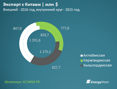 В 2016 году Актюбинская, Карагандинская и Кызылординская области — основные региональные экспортеры в торговле с Китаем, — сократили экспорт в КНР на 23%. Объем экспорта Актюбинской области в Китай уменьшился на 36%, Кызылординской — на 47%, более стабильным остается экспорт Карагандинской области (-5% за год).