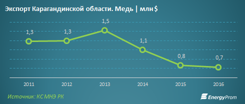 В 2016 году Карагандинская область продала в Китай меди и медных сплавов на $725,5 млн. Это на 5% меньше суммы экспорта в 2015 году, однако физический объем продаж увеличился на 12%. Треть всего экспорта области идет в Китай.